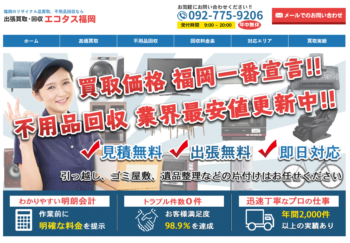 福岡市ならびに福岡県内の不用品回収業者のエコタス福岡の特徴や口コミ、料金をご紹介します。