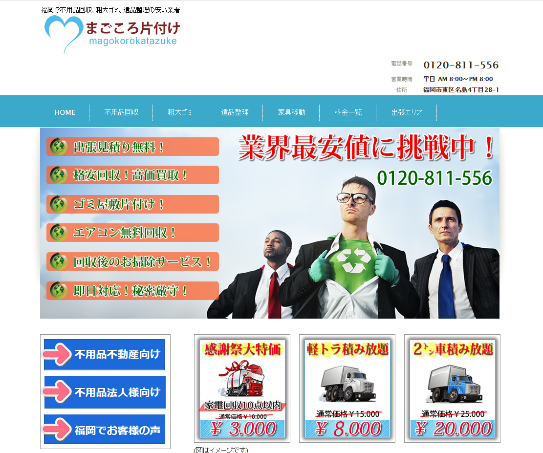 地域密着点として、福岡の不用品回収、遺品整理、粗大ごみの悩み解決がメインのようです。